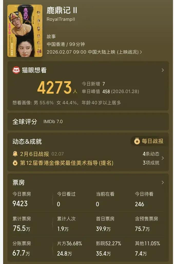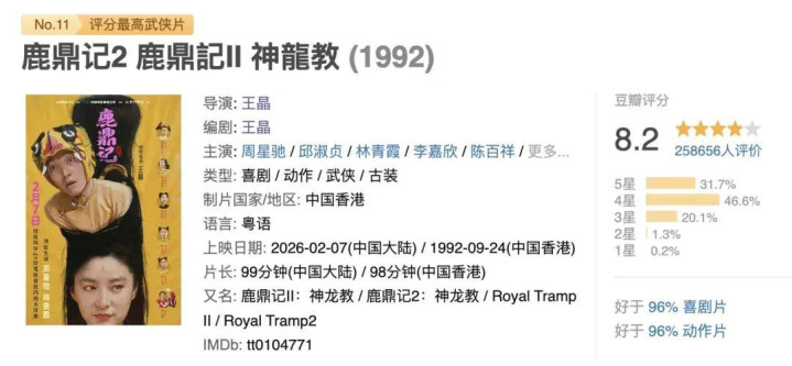 讲重映,这周最夺方针不是《闪灵》,而是《鹿鼎记2》。星爷主演,碎裂里齐是大名鼎鼎的卡司,林青霞那会儿的风采到今天看也不输。片方还作念了4K建树,按理说噱头够。效果上了四天,总票房七十五万,分账惟一二十四点八万。影院一线把这叫“二月票房惨案”,数字摆在那里,连《闪灵》的百分之一路没摸到边。