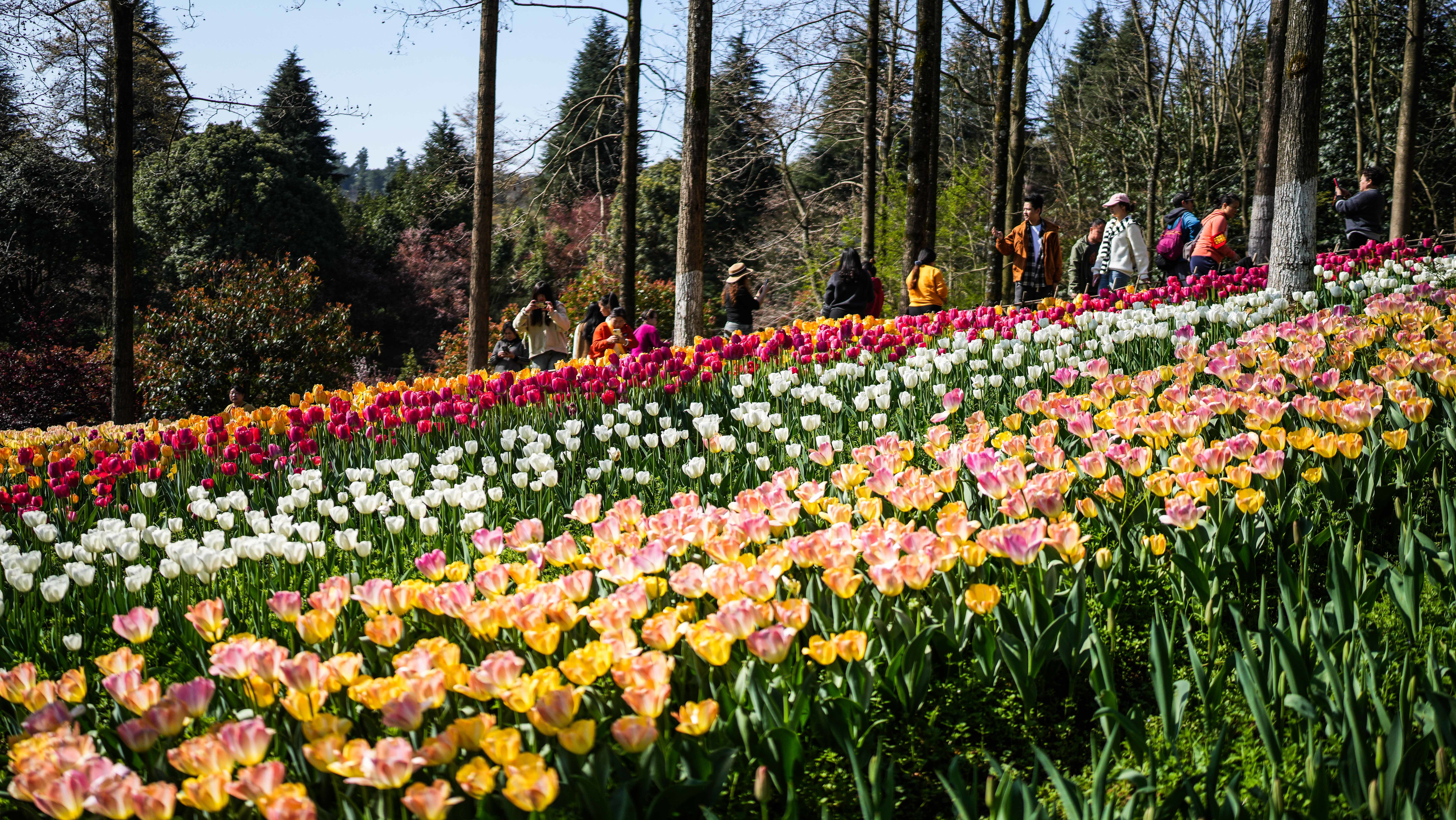 近日,贵州省黔南布依族苗族自治州龙里县龙架山国度丛林公园内的数万株郁金香竞相绽放,诱骗各地旅客前来游观赏景。