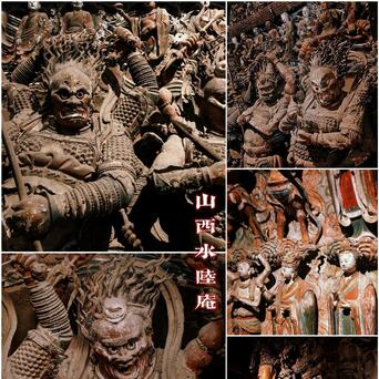 在水陆庵的大殿里,共分为南北山墙、殿中正隔间两壁及两檐墙四部分,其中尤以南北墙上的泥塑最为精彩。它接纳连环画的相貌,演绎了佛祖释迦牟尼一世传略故事,十分生动传神。泥塑涵盖山水桥梁、园林瀑布、亭台楼阁和殿宇浮图等建造;有诸佛菩萨、二十四诸天、五百罗汉过海、千东谈主听经图、释迦牟尼涅槃泥像;另有鸟、兽、麒麟等动物形象。东谈主物造型之多、形象之剖析、配景之磅礴、号称一部雕镂的释教史诗。