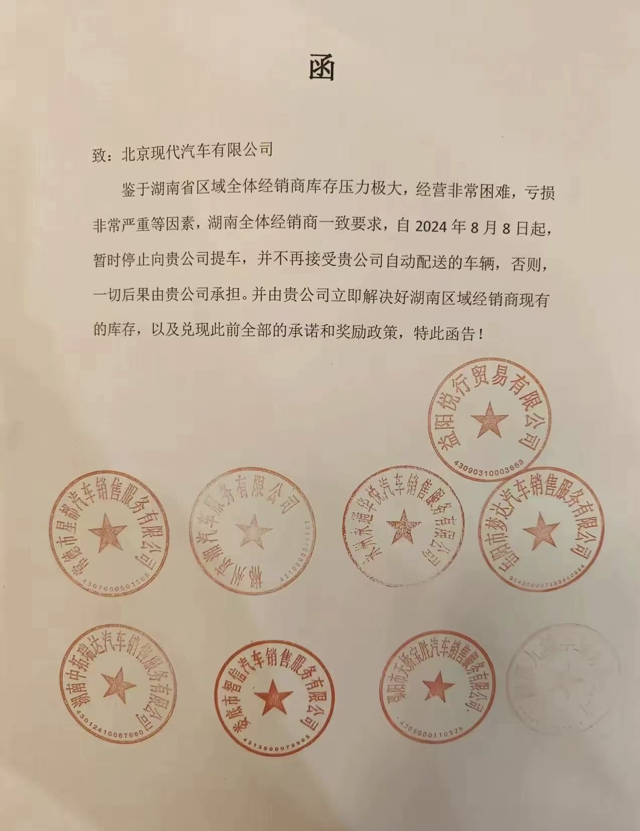 8月8日,一份网传的湖南省经销商致北京当代的函流传于网罗,该信函称,鉴于湖南省区域合座经销商库存压力极大,筹划相等艰巨,亏空相等严重等要素,湖南合座经销商一致条件,自2024年8月8日起暂时罢手向贵公司提车,并不再给与贵公司自动配送的车辆,不然,一切着力由贵公司承担。并由贵公司立即处置好湖南区域经销商现存的库存,以及竣事此前沿途的应许和奖励策略。信函底部有9家汽车经销商的盖印。