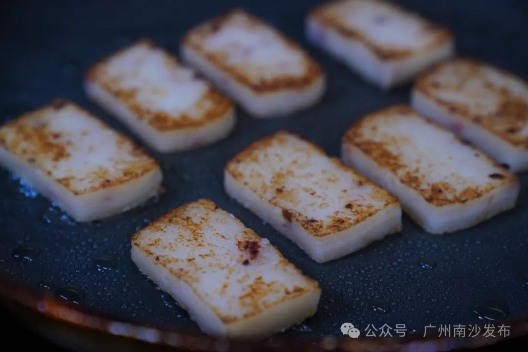小南在现场看到,大厨把椰汁红糖年糕和萝卜糕切成薄片,将椰汁红糖年糕放入锅中蒸,萝卜糕则下锅煎。一技能,厨房里香气四溢。