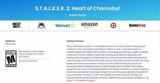 《潜行者2》近日在好意思国和加拿大取得了ESRB评级,评级为M/17+体育游戏app平台,《潜行者2》的发售日已定为11月20日。