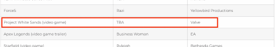 配音演员Natasha Chandel的个东说念主页面可能依然被修改,但在她的“配音”部分,列出了一个名为“Project White Sands”的游戏技俩。天然她莫得泄漏为哪些变安装音,但这个技俩属于Valve。玩家们算计,“White Sands”有时率与《半条命3》筹办,因为“White Sands是新墨西哥州的一个公园……也等于游戏中黑山的地方地”。一位驳斥者指出:“这类暴露老是情理的,这是一个莫得过程任何网红过滤的第一手音问。”