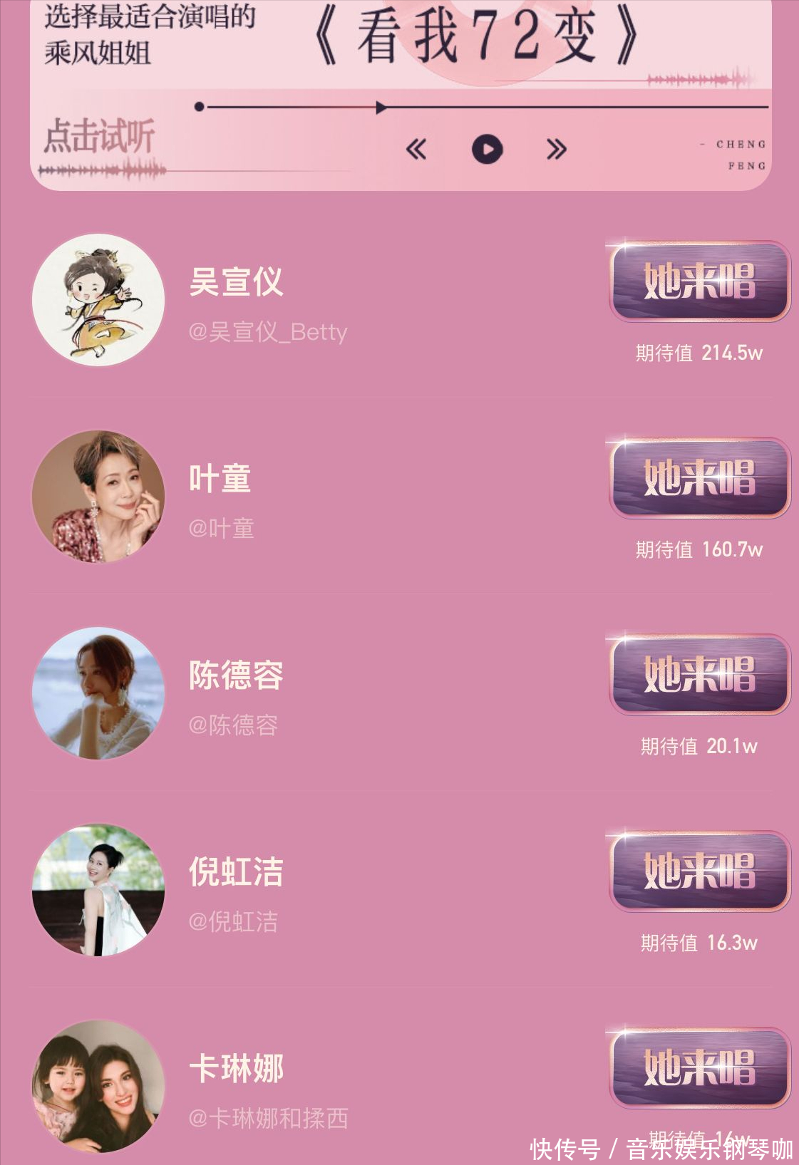 按照现阶段排行那基本可以证据《看我72变》的姐姐有叶童、吴宣仪、陈德容、倪虹洁和卡琳娜。