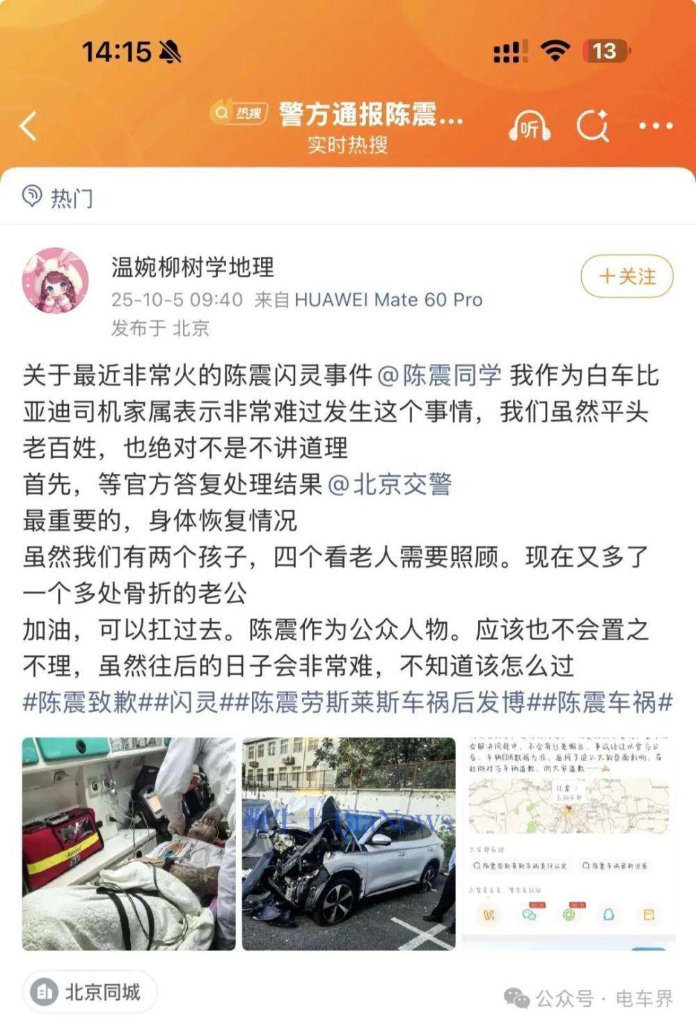 电车界10月5日音书疑似陈震劳斯莱斯闪灵车祸撞飞比亚迪车主家属在微博现身,称老公多处骨折。