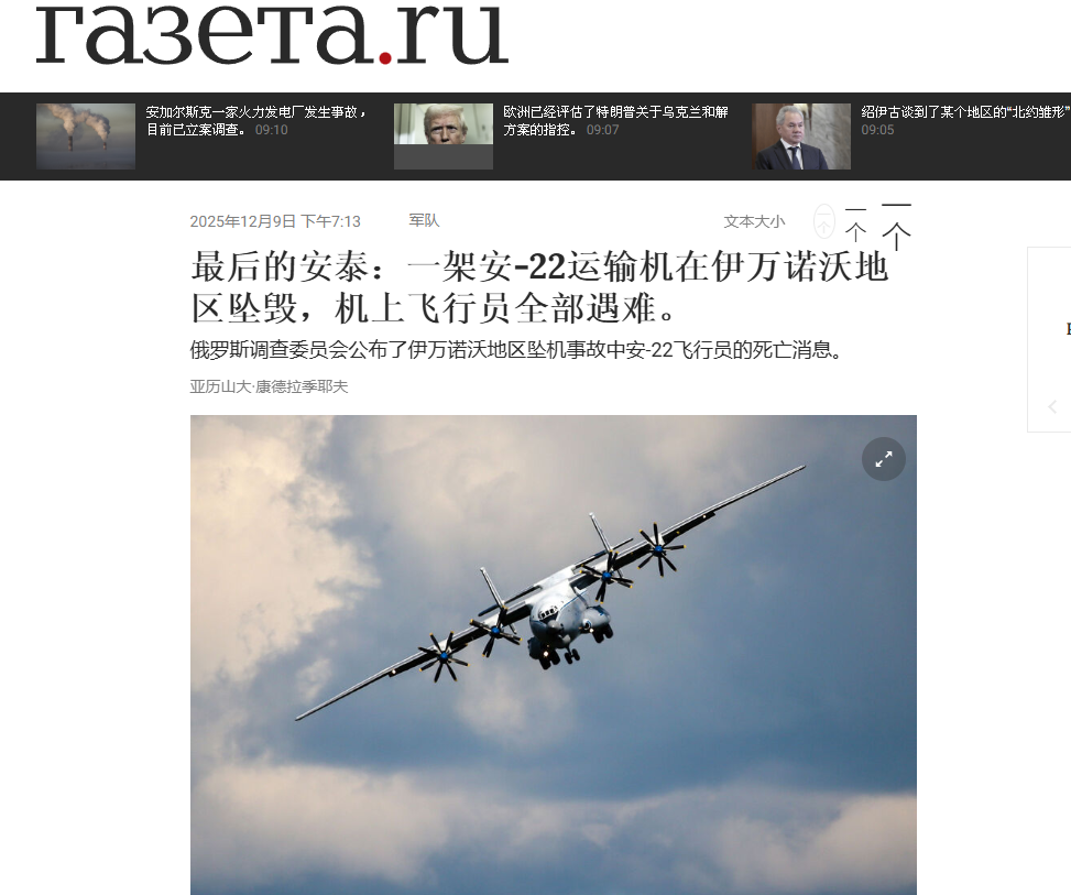 俄罗斯空天军近日证明,一架安-22“安泰”重型军用运送机在伊万诺沃州进行维修后的试飞经由中祸殃坠毁,机上7名机组东说念主员一说念遭难,溃不行军。