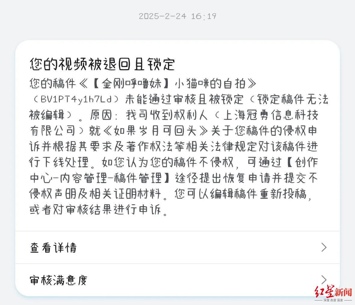 2月24日,她在哔哩哔哩平台收到了官方提示,称视频未能通过审核且被锁定,原因为收到权柄东说念主(上海冠勇信息科技有限公司)就《要是岁月可回头》对于视频的侵权讲述并把柄条件及著述权法等关系法律限定对该视频进行下线处罚。本日,她向客服响应,客服称已还原视频。但次日,她又收到了一样的提示,实质不变,视频再次被下架。经过再次响应后,该视频还原泛泛。
