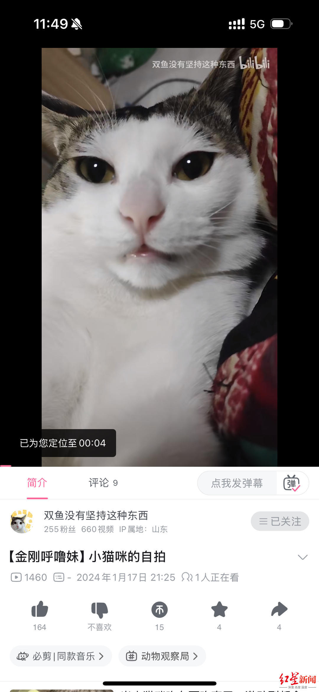 哔哩哔哩平台自大,此前被下线的视频发布于2024年1月17日,标题为“【金刚呼噜妹】小猫咪的自拍”。博主解释,这段视频实质为她在家中拍摄的猫咪,拍摄视频时,猫扶着她的手机,即“自拍”角度。视频悉数22秒。记者看到,该视频实质均为猫,猫占据了大部分画面,有一部分房间布景清楚。其提供的原始视频信息自大,该视频拍摄于发布前日,由于时间较久,其未保留裁剪过程的工程文献。